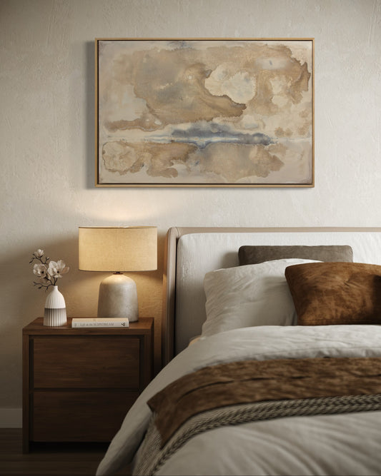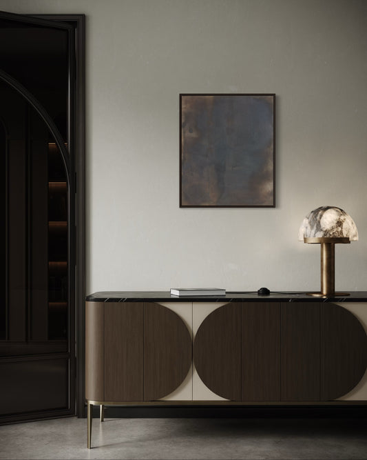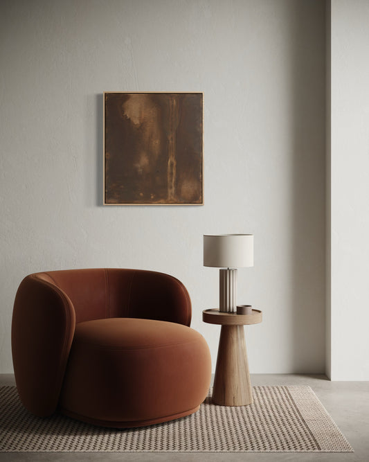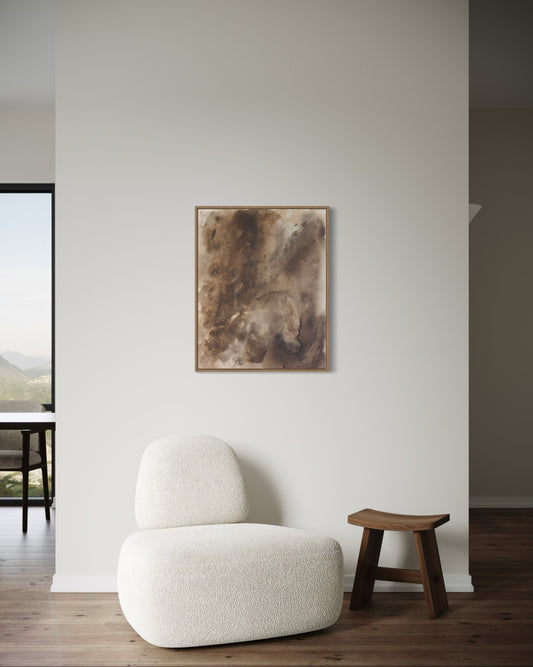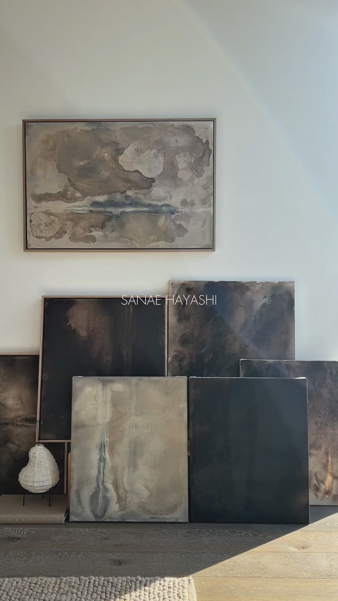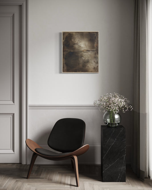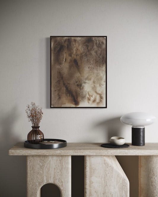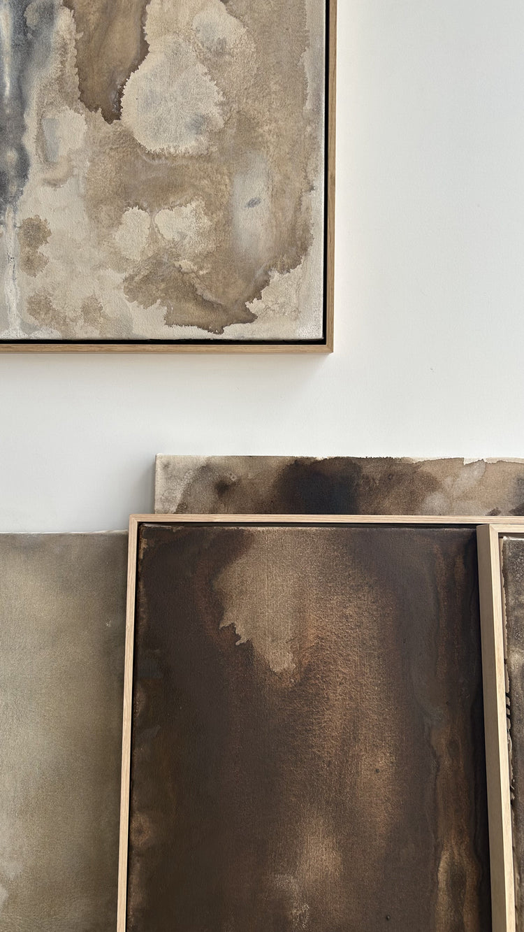 The visual language draws from pottery and natural materials - restrained palettes of ink black, mineral browns, and soft neutrals. Each work carries the texture of time: subtle layers, intentional irregularities, and quiet spaces that allow the eye to rest.