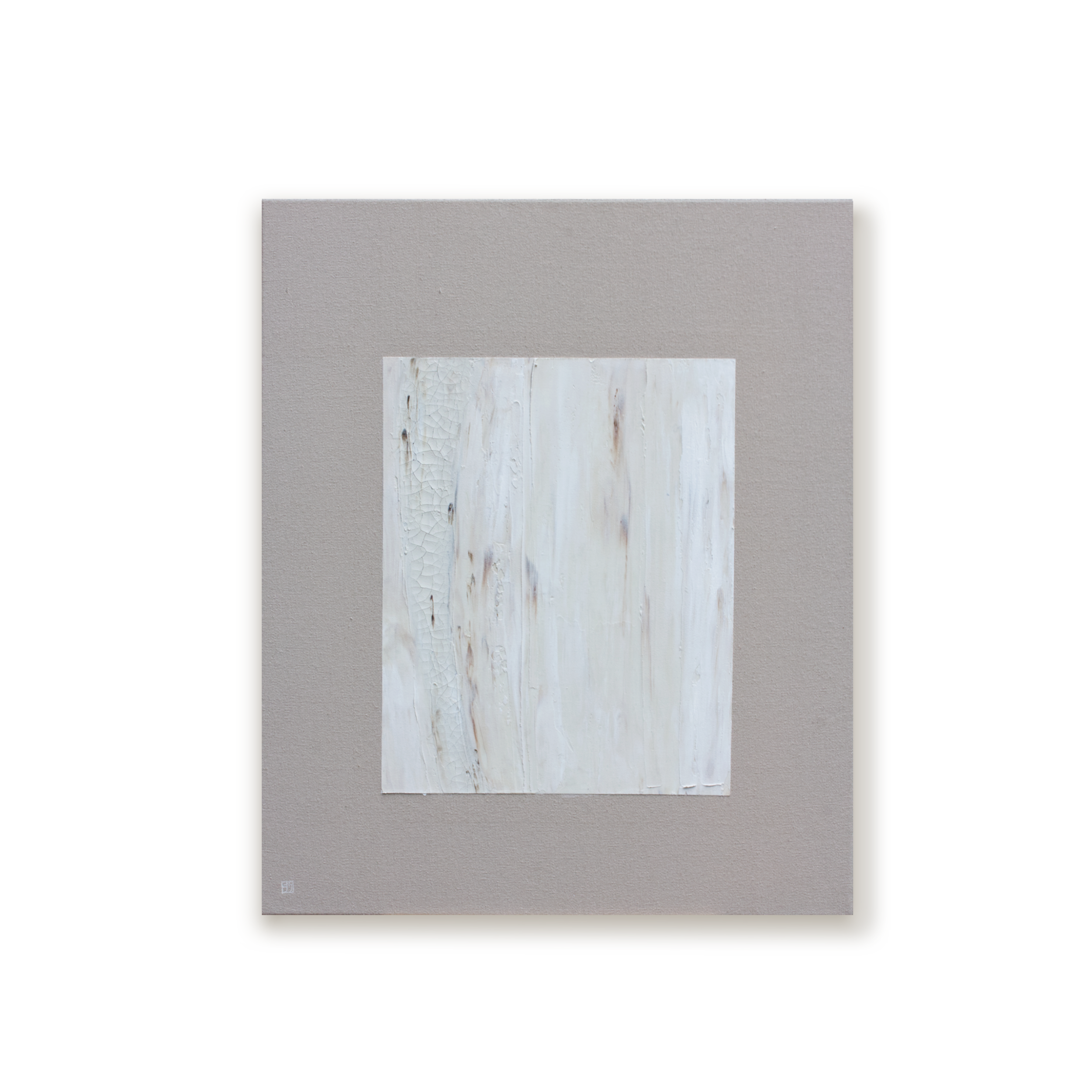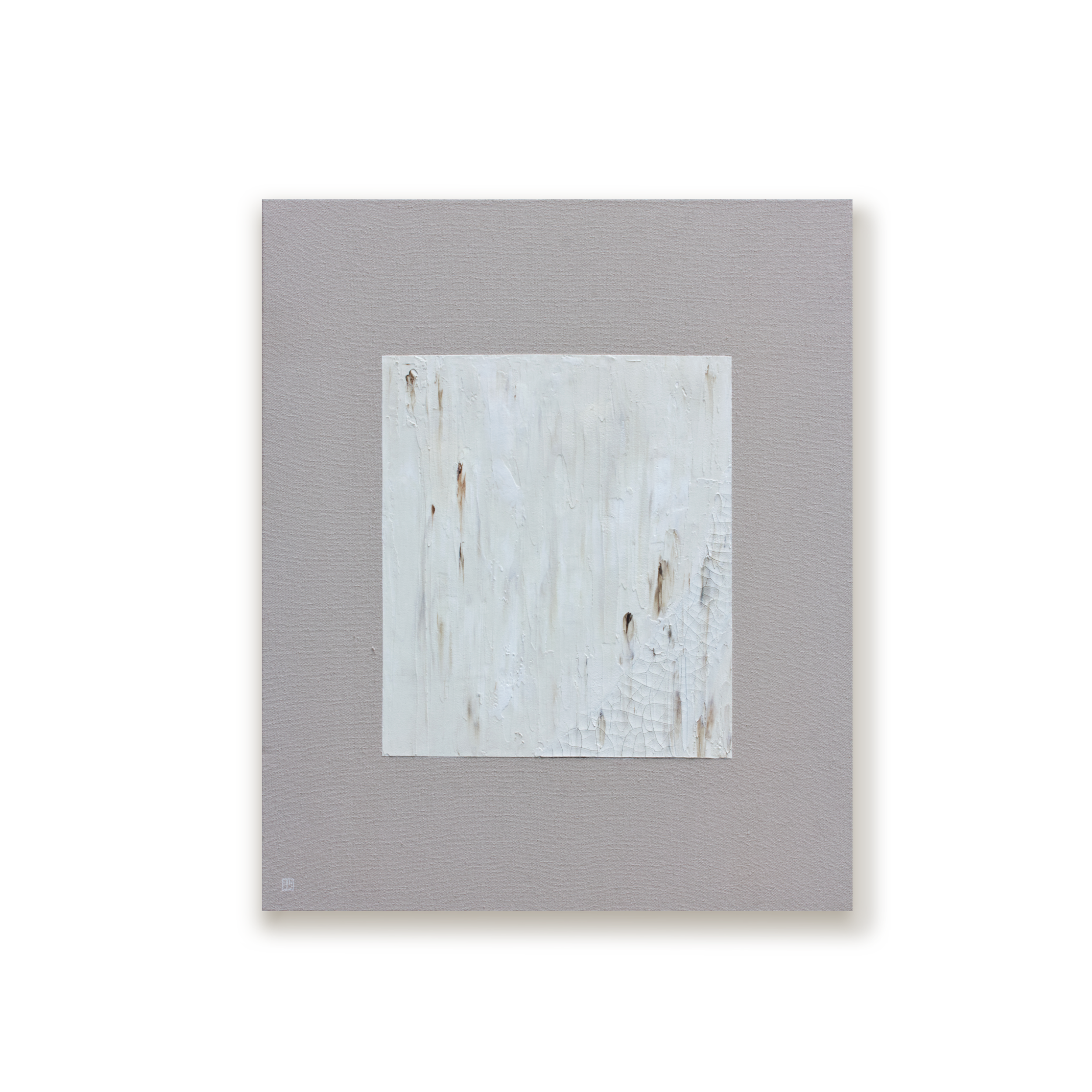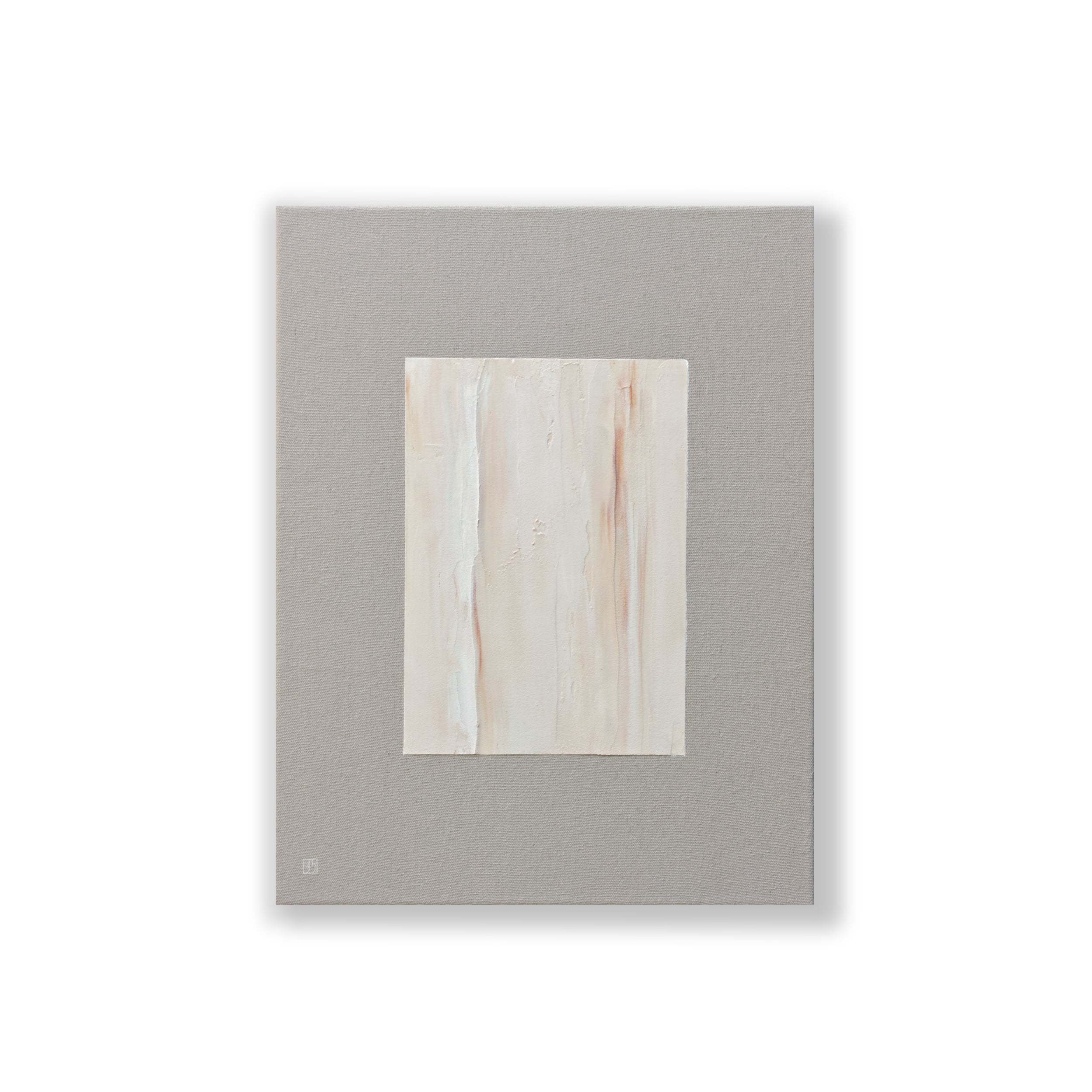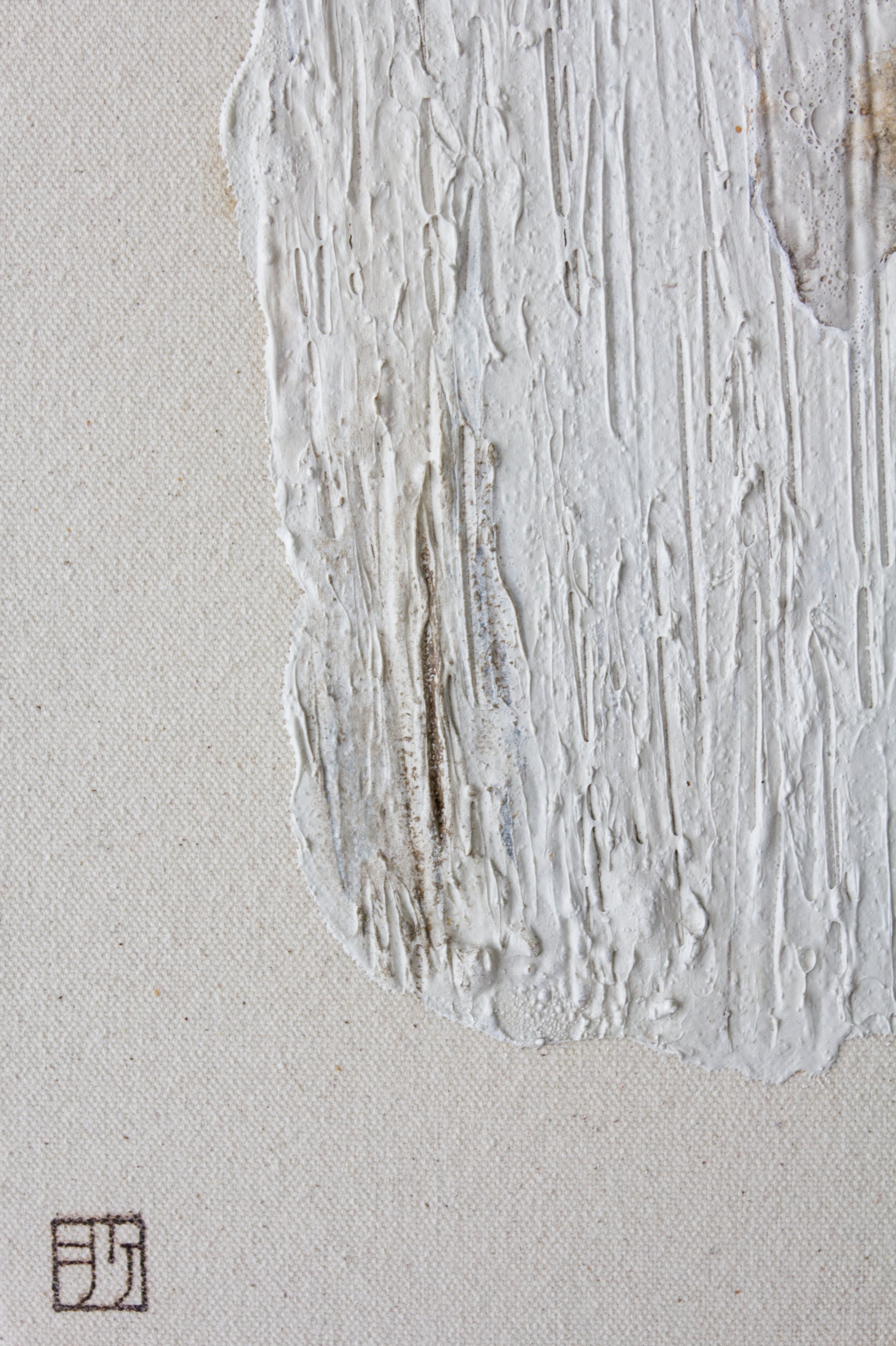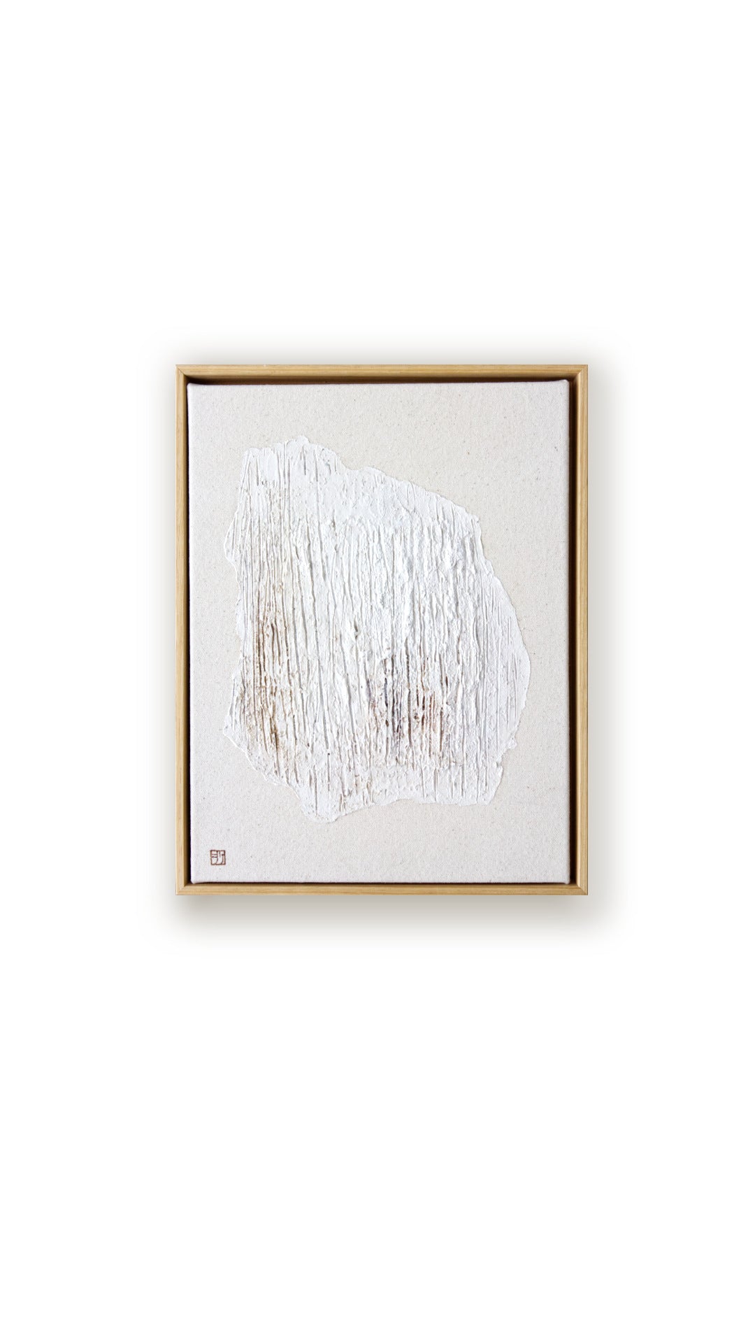 Inspired by a Shigaraki-yaki pot in Ginza, this work translates the gentle tones and flowing unpredictability of ceramics onto canvas. Through a self-developed technique, I created a “lava effect” surface, evoking wabi-sabi’s quiet beauty in imperfection and natural texture.
